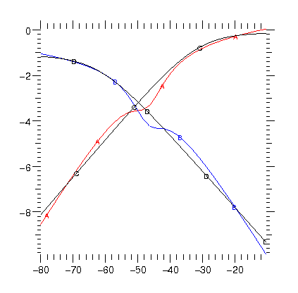 25 July - Porting models The choice not to support arbitrary expressions for state transition rates means that to re-implement existing models requires fitting a Boltzmann type transition to the legacy models. The image shows the type of problem that can arise. In black are the forward and reverse transition rates as a function of membrane potential (log rate in ms against mV). In red and blue are the best fits to these rates. It remains to be seen if there are any functional differences in the behavior of the model.
