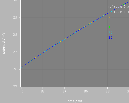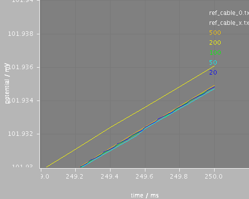 Cable, 100um long, run for 250ms with different timesteps between 20 and 500 microseconds