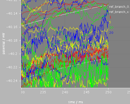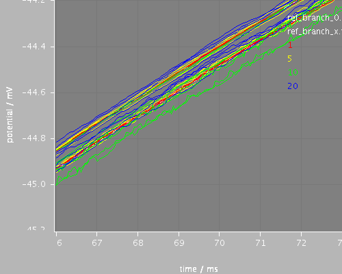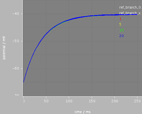 For each timestep (and for the reference) there are two curves: the potentail at the root of the tree and the potential at a terminal. Note that for this set of cell properties, the two potentials are very close throughout the simulation and are barely distinguishable in the first figure.