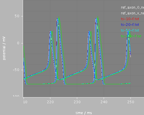 The magenta and cyan lines show how increasing the timestep makes very little change to the spike shape, but changes the period slightly such that by the end of the calculation the longer timestep calculation has spikes a few milliseconds behind. This is a normal feature of the implicit euler method arising from the use of forward differencing for the time derivative.