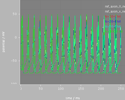 <PSICSRun lib="." timeStep="0.1ms" runTime="250ms" startPotential="-65mV" morphology="cell" environment="environment" properties="membrane" access="recording" stochThreshold="0"> <StructureDiscretization baseElementSize="1um"/> <info>Cable with HH sodium and potassium channels, different timesteps</info> <RunSet vary="timeStep" values="[10, 20, 50, 100]us" filepattern="ts-$.txt"/> <ViewConfig> <LineGraph width="500" height="400"> <XAxis min="0" max="250" label="time / ms"/> <YAxis min="-80" max="60" label="potential / mV"/> <Line file="ref_axon_0_neuron.txt" color="white" width="1" rescale="[1000, 1000.]"/> <Line file="ref_axon_x_neuron.txt" color="white" width="1" rescale="[1000, 1000.]"/> <LineSet file="ts-10-f.txt" color="red"/> <LineSet file="ts-20-f.txt" color="blue"/> <LineSet file="ts-50-f.txt" color="cyan"/> <LineSet file="ts-100-f.txt" color="green"/> <View id="whole" xmin="-10." xmax="260." ymin="-100." ymax="80."/> <View id="start" xmin="0." xmax="30." ymin="-100." ymax="80."/> <View id="end" xmin="210." xmax="255." ymin="-100." ymax="80."/> </LineGraph> </ViewConfig> </PSICSRun>