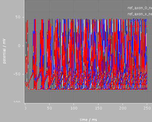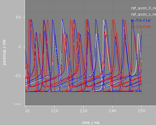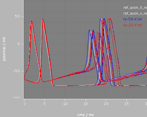 <PSICSRun lib="." timeStep="0.1ms" runTime="250ms" startPotential="-65mV" morphology="cell" environment="environment" properties="membrane" access="recording" stochThreshold="10000" repeats="4"> <StructureDiscretization baseElementSize="5um"/> <info>Cable with HH sodium and potassium channels</info> <RunSet vary="timeStep" values="[20, 50]us" filepattern="ts-$.txt"/> <ViewConfig> <LineGraph width="500" height="400"> <XAxis min="0" max="250" label="time / ms"/> <YAxis min="-80" max="60" label="potential / mV"/> <Line file="ref_axon_0_neuron.txt" color="white" width="1" rescale="[1000, 1000.]"/> <Line file="ref_axon_x_neuron.txt" color="white" width="1" rescale="[1000, 1000.]"/> <LineSet file="ts-50-f.txt" color="blue"/> <LineSet file="ts-20-f.txt" color="red"/> <View id="whole" xmin="-10." xmax="260." ymin="-100." ymax="80."/> <View id="start" xmin="0." xmax="30." ymin="-100." ymax="80."/> <View id="end" xmin="210." xmax="255." ymin="-100." ymax="80."/> </LineGraph> </ViewConfig> </PSICSRun>