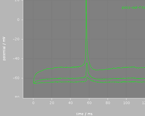 <PSICSRun lib="." timeStep="0.1ms" runTime="120ms" startPotential="-65mV" morphology="morph" environment="environment" properties="membrane" access="recording-a" stochThreshold="50000"> <StructureDiscretization baseElementSize="10um"/> <info>Migliore et al CA1 pyramidal cell</info> <About> Model corresponding to figure 1a with a steady current injection at the soma and recording from two points on the apical dendrite, 200um and 400um from the soma. It shows some backpropagation to 200um but very little at 400um. </About> <About> This is not an exact reimplementation of the Migliore et al model but rather a nearby equivalent in PSICS using only the standard channel transition equation. Slow inactivation of the sodium channel has not been modelled as an independent gate that only partially closes (closing to 20% in the soma and to 50% in the dendrites) since the kinetics of this process do not appear to affect the model. Instead, the inactivated dendritic channels are simply left out of the model by providing two populations: one population, at 50% of maximum, that covers all active compartments and another, overlapping population, just for the soma. </About> <ViewConfig> <LineGraph width="500" height="400"> <XAxis min="0" max="250" label="time / ms"/> <YAxis min="-80" max="60" label="potential / mV"/> <LineSet file="psics-out-f.txt" color="green"/> <View id="whole" xmin="-10." xmax="120." ymin="-80." ymax="20."/> <View id="first" xmin="15" xmax="30." ymin="-80." ymax="20."/> </LineGraph> </ViewConfig> </PSICSRun>