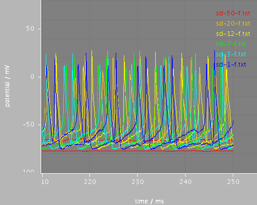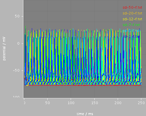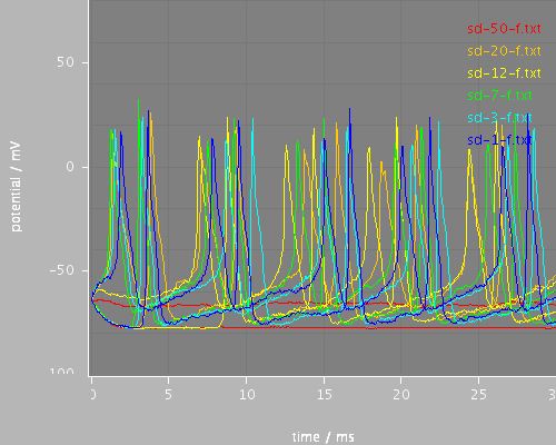<PSICSRun timeStep="0.05ms" runTime="250ms" startPotential="-65mV" morphology="cell" environment="environment" properties="membrane" access="recording" stochThreshold="10000"> <StructureDiscretization baseElementSize="3um"/> <info>Cable with propagating spikes, varying discretization, stochastic</info> <RunSet vary="baseElementSize" values="[1, 3, 7, 12, 20, 50]um" filepattern="sd-$.txt"/> <ViewConfig> <LineGraph width="500" height="400"> <XAxis min="0" max="250" label="time / ms"/> <YAxis min="-80" max="60" label="potential / mV"/> <LineSet file="sd-50-f.txt" color="red"/> <LineSet file="sd-20-f.txt" color="orange"/> <LineSet file="sd-12-f.txt" color="yellow"/> <LineSet file="sd-7-f.txt" color="green"/> <LineSet file="sd-3-f.txt" color="cyan"/> <LineSet file="sd-1-f.txt" color="blue"/> <View id="sd-whole" xmin="-10." xmax="260." ymin="-100." ymax="80."/> <View id="sd-start" xmin="0." xmax="30." ymin="-100." ymax="80."/> <View id="sd-end" xmin="210." xmax="255." ymin="-100." ymax="80."/> </LineGraph> </ViewConfig> </PSICSRun>