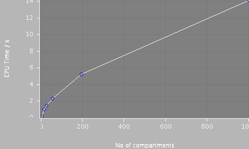 Compartments | Stochastic channels / cpmts | Continuous channels / cpmts | time/ms | timestep/ms | baseElementSize | CPU Time / s |